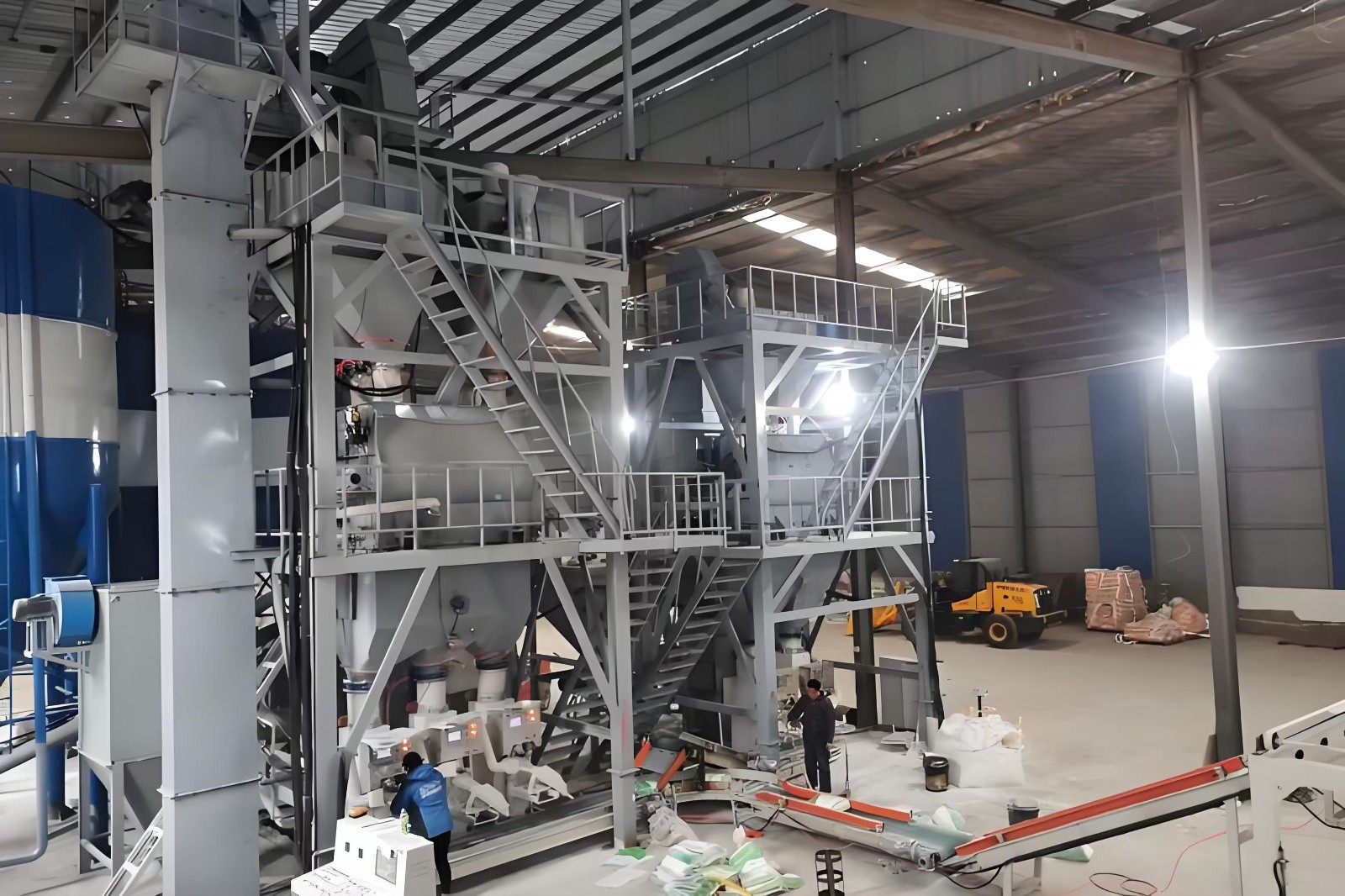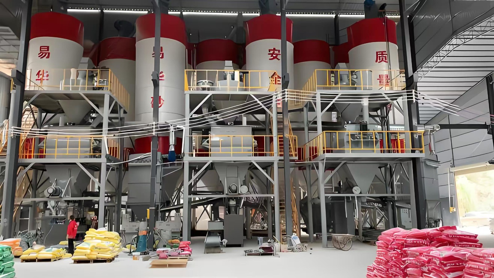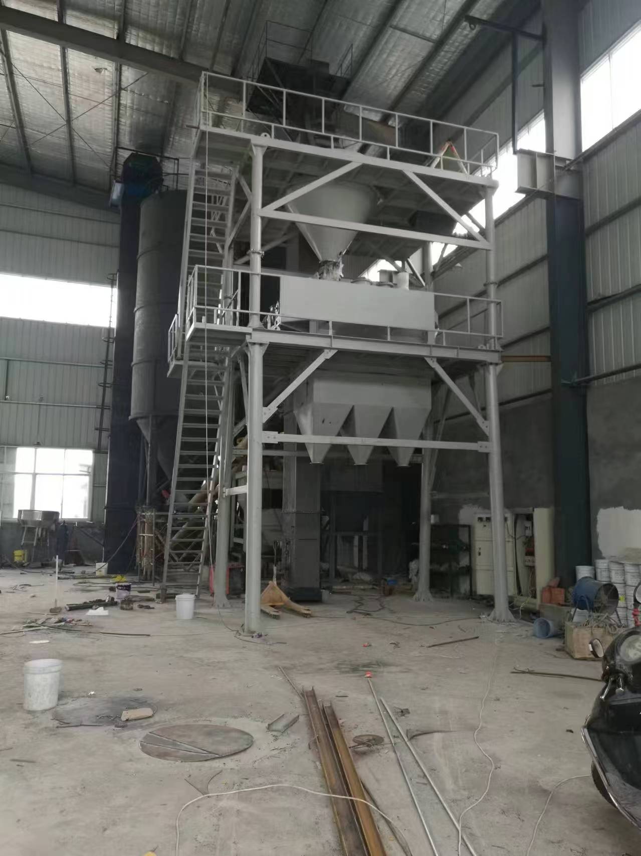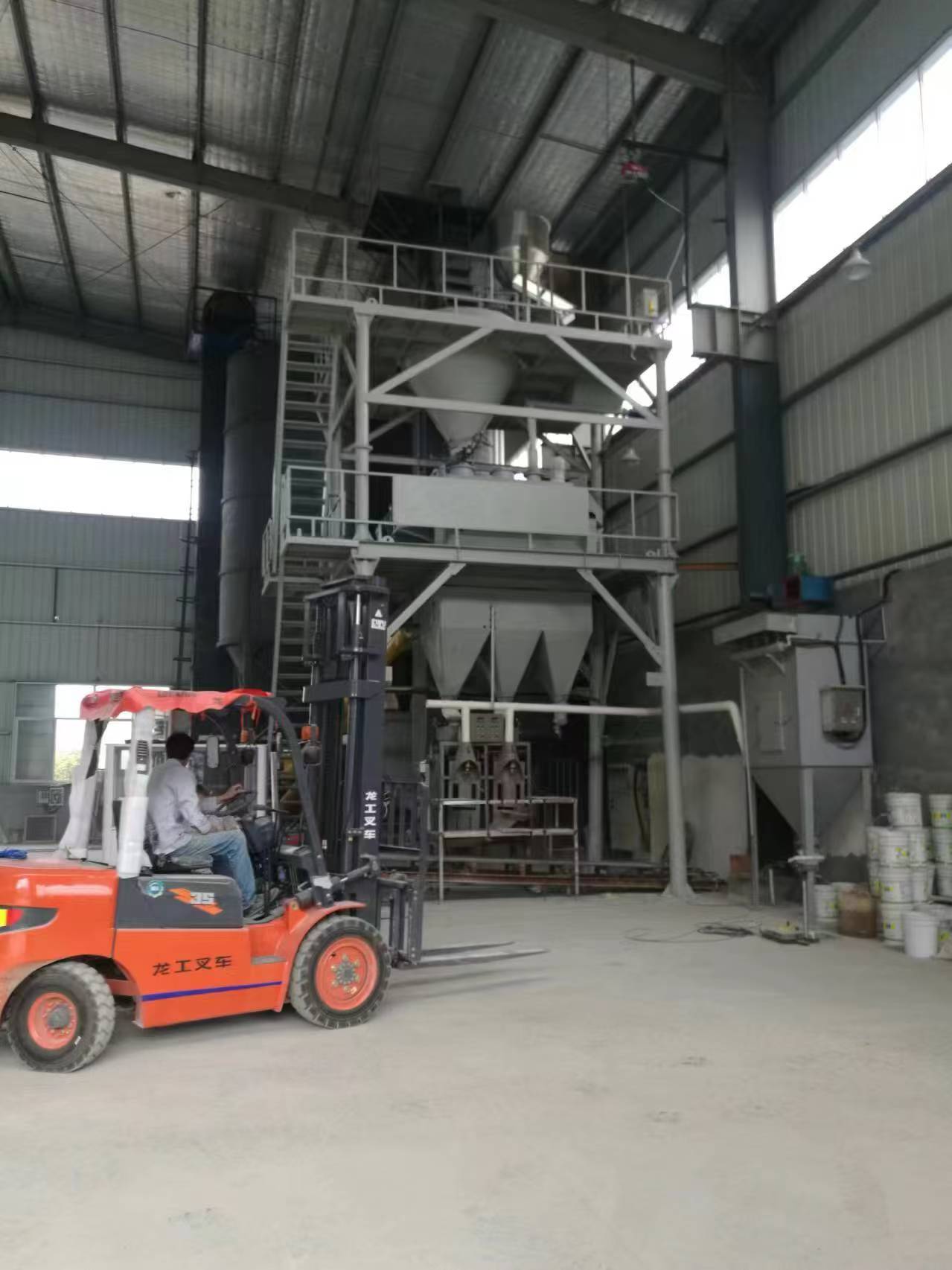 该全自动干混砂浆成套设备一般情况下会用到3-6个原料罐,其中两个大罐用于装放沙子、水泥等主要原料,其余小罐用于装放添加剂等小料。原料需要使用斗式提升机提入小罐,巧妙的物料分配系统支持一个斗式提升机分配式作业,从而避免了资源浪费。计量系统在计量螺旋的配合下,把料仓中的原料导入计量仓,通过传感器的数据反馈,实现原料计量。计量好后的物料,通过螺旋输送机导进主斗提机,提升到混合机上部待混料仓中。待混仓为气动大开门型,可以迅速将待混物料放入无重力混合机,实现干混砂浆的连续生产。